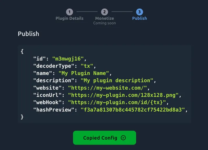 Review the information and the details saved. Copy your plugin config and send it to us.