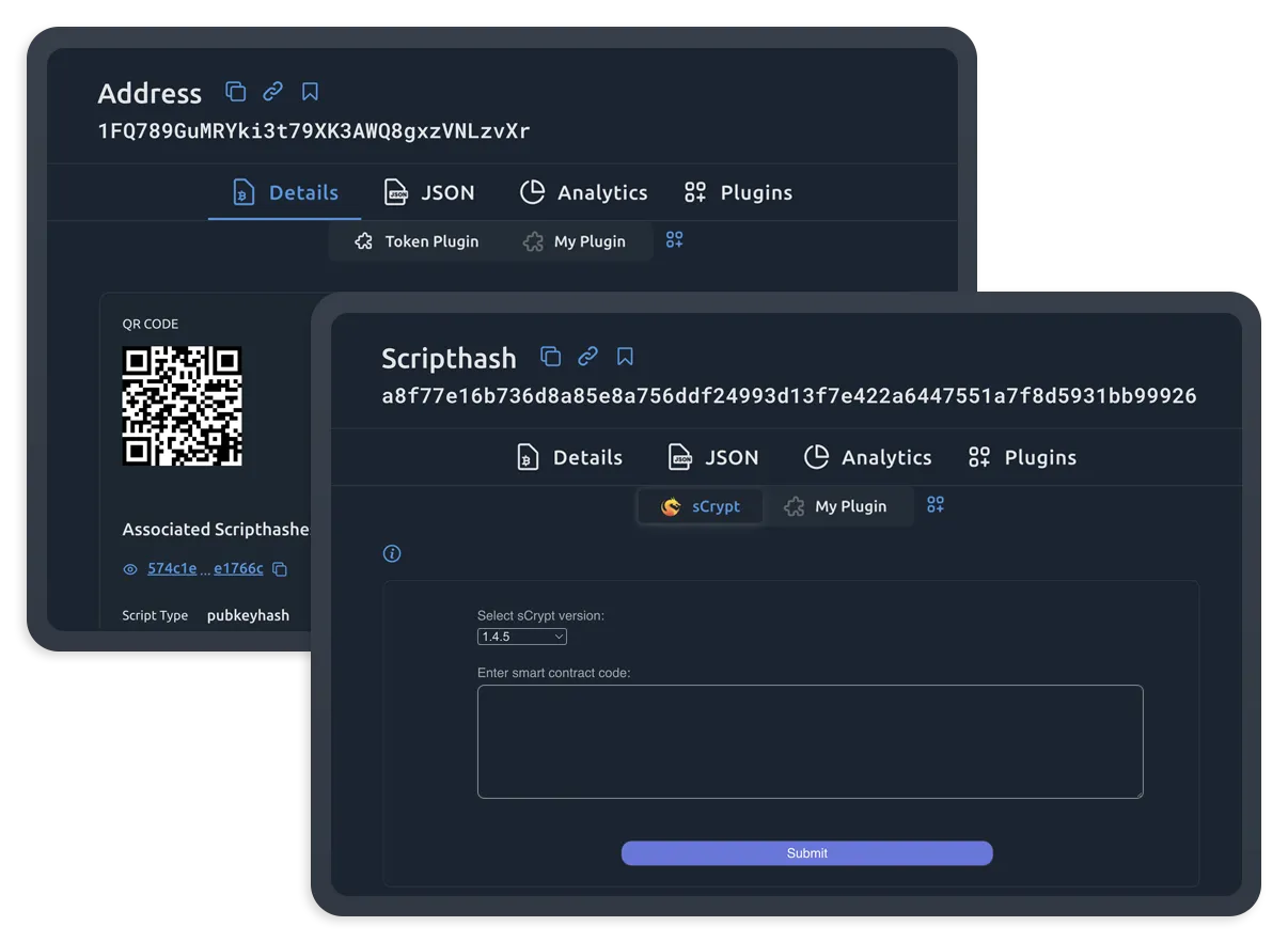 With plugins, include more context or offer another view for transactions, blocks, addresses, OP_RETURN data, or search terms used by users.